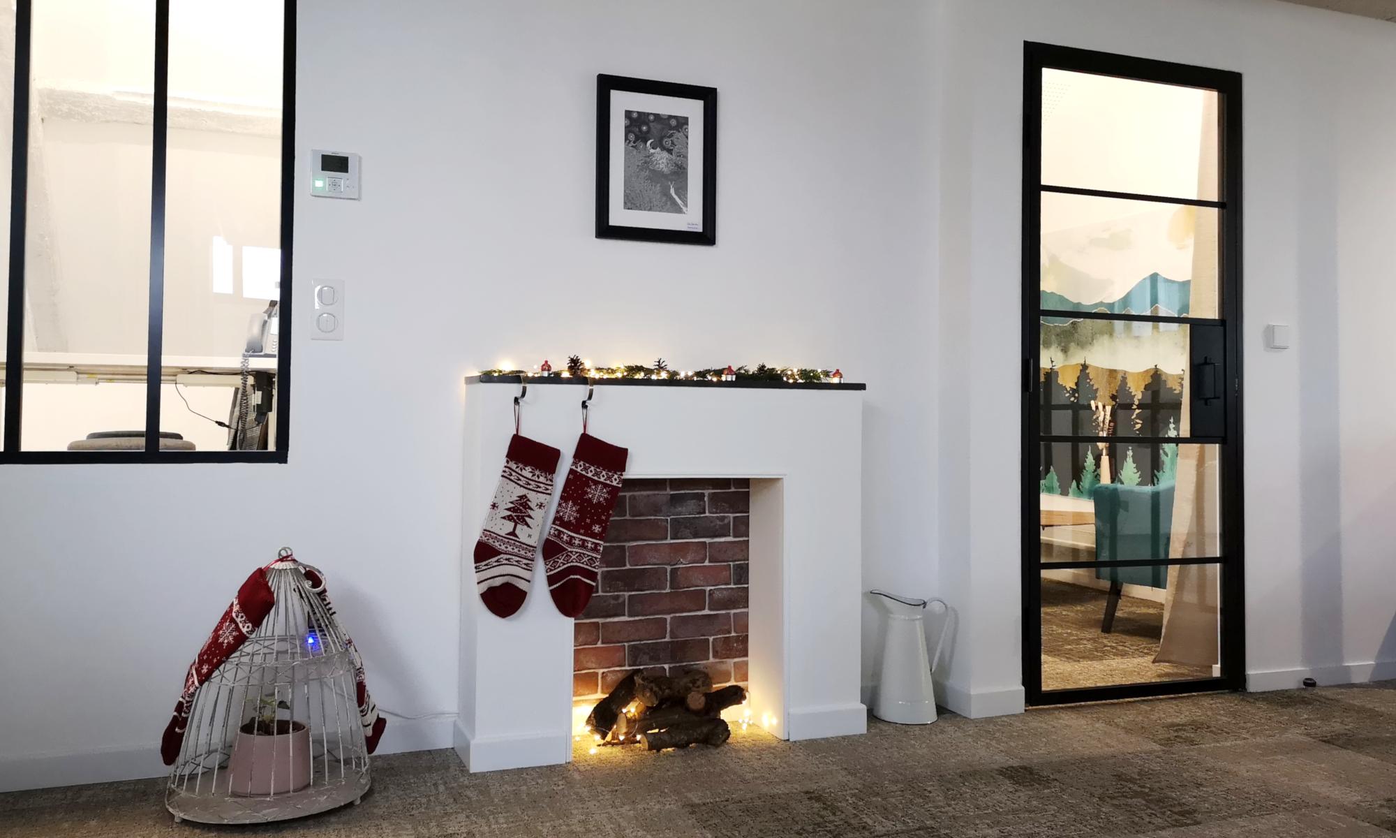 Un sapin et une cheminée fabrication maison, quelques décorations et guirlandes, et voilà une ambiance chaleureuse !