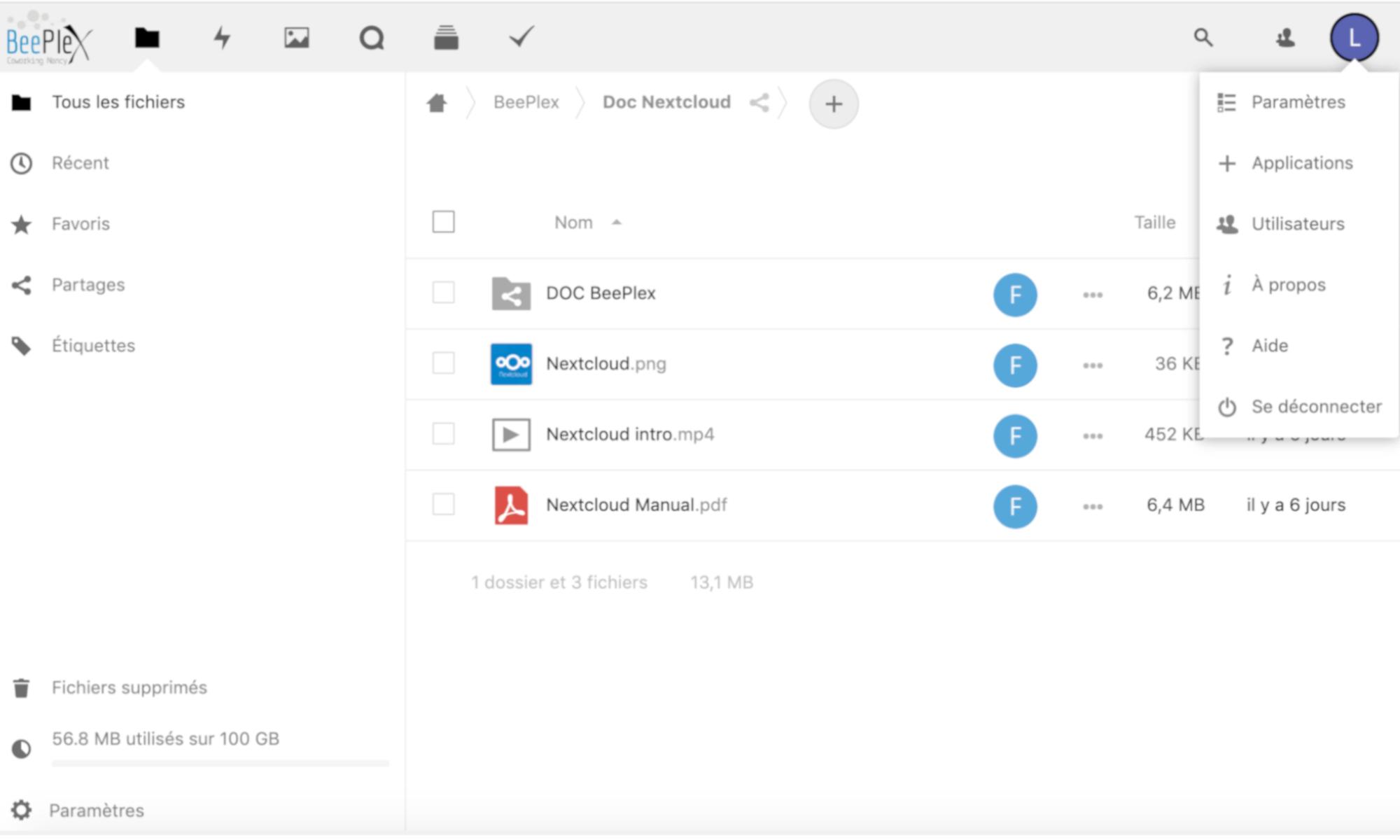 L’Interface de recherche permet de chercher à travers toutes les applications Nextcloud : les fichiers, les commentaires, les discussions Talk, les calendriers, les tableaux et cartes Deck, les emails, les contacts, les tâches, les marque-pages, les applications et même dans les paramètres. Un simple filtre vous permettra de mieux cibler vos recherches par application.