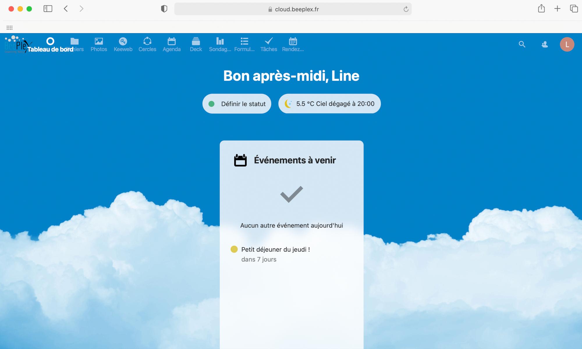 Tableau de bord : page d’accueil contenant des résumés de vos applications, fichiers, messagerie instantanée, événements, etc.